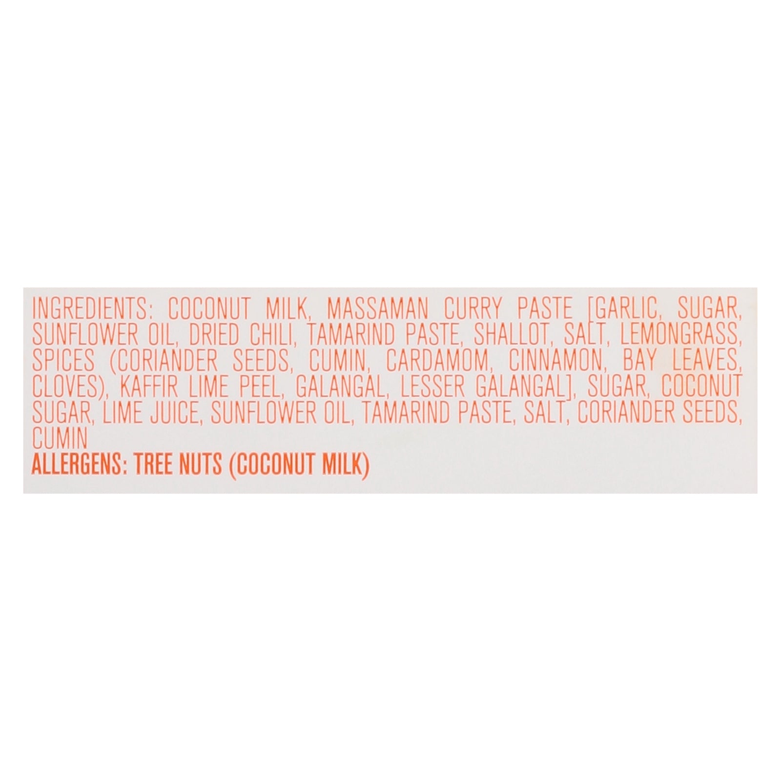 ingredients : coconut milk;massaman curry paste [garlic, sugar, sunflower oil, dried chili, tamarind paste, shallot, salt, lemongrass, spices (coriander seeds, cumin, cardamom, cinnamon, bay leaves, cloves), kaffir lime peel, galangal, lesser galangal];sugar;coconut sugar;lime juice;sunflower oil;tamarind paste;salt;coriander seeds;cumin