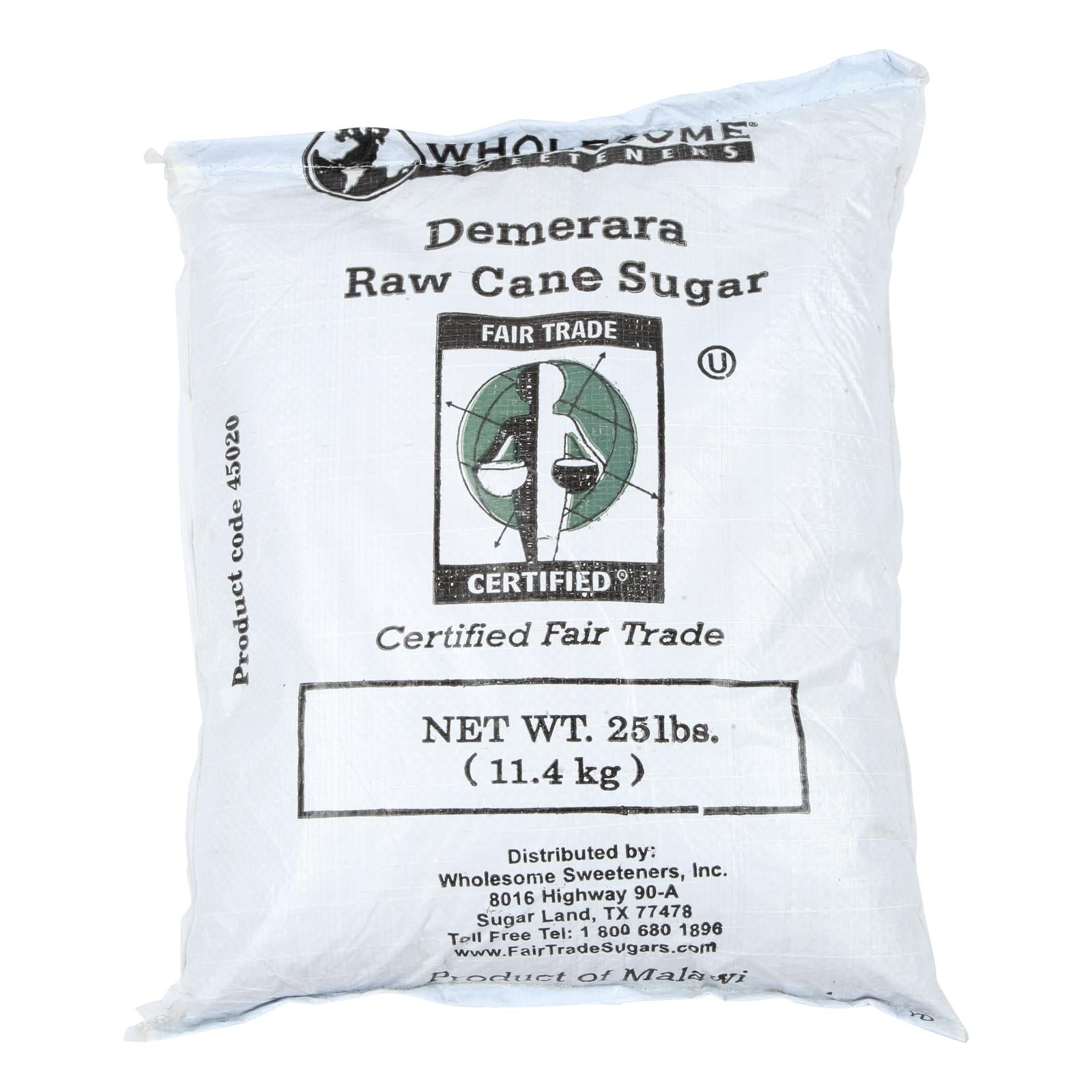 Bulk wholesome! demerara raw cane sugar is a certified fair trade product. Demerara raw sugar is naturally gluten-free and vegan and is a great substitute for refined sugar that can be used in many recipes. Demerara sugar is approved for kosher diets. This bag holds 25 pounds of raw demerara sugar for use in the food service industry.