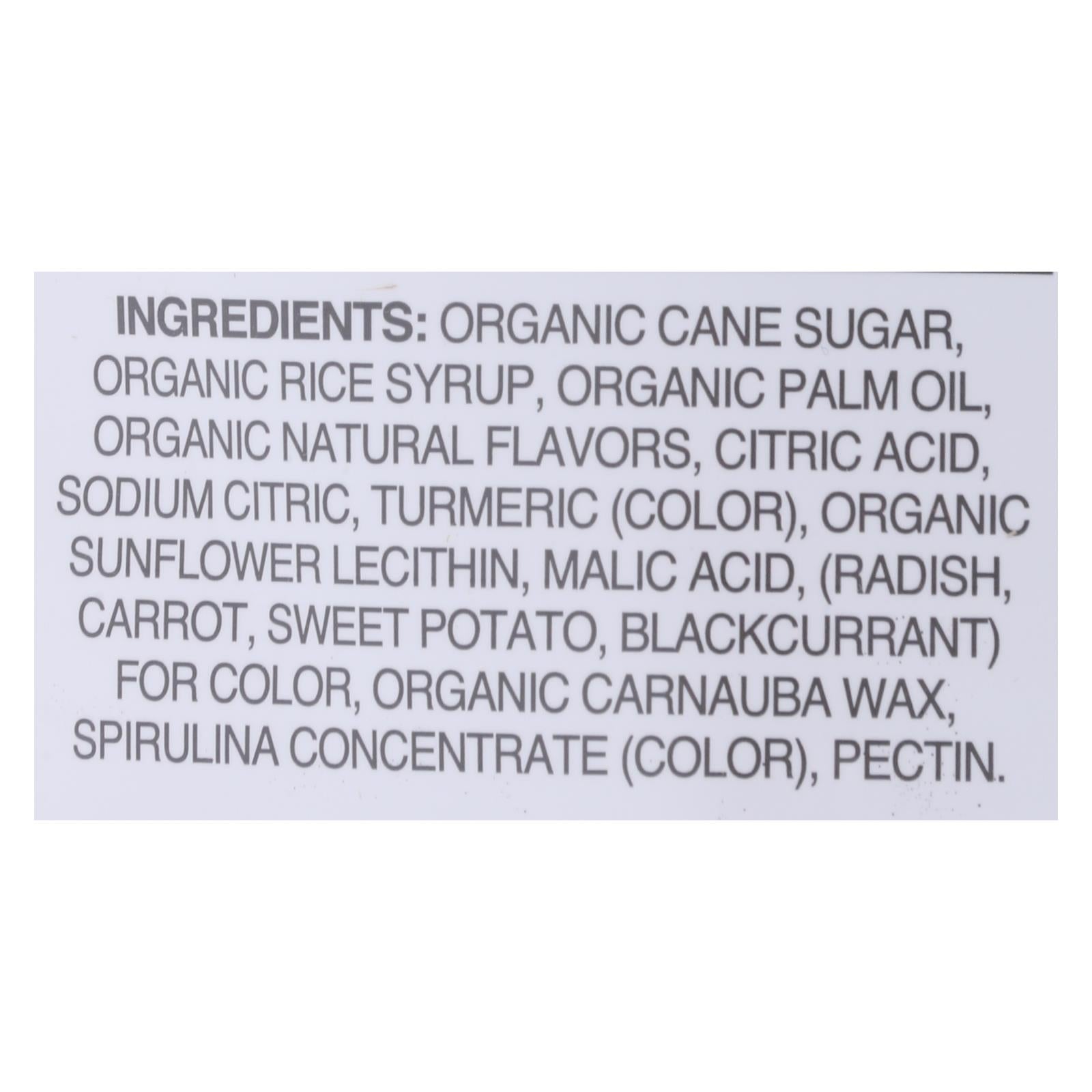 ingredients : organic cane sugar;organic rice syrup;organic palm oil;organic natural flavors;citric acid;sodium citric;turmeric (color);organic sunflower lecithin;malic acid;(radish, carrot, sweet potato, blackcurrant) for color;organic carnauba wax;spirulina concentrate (color);pectin