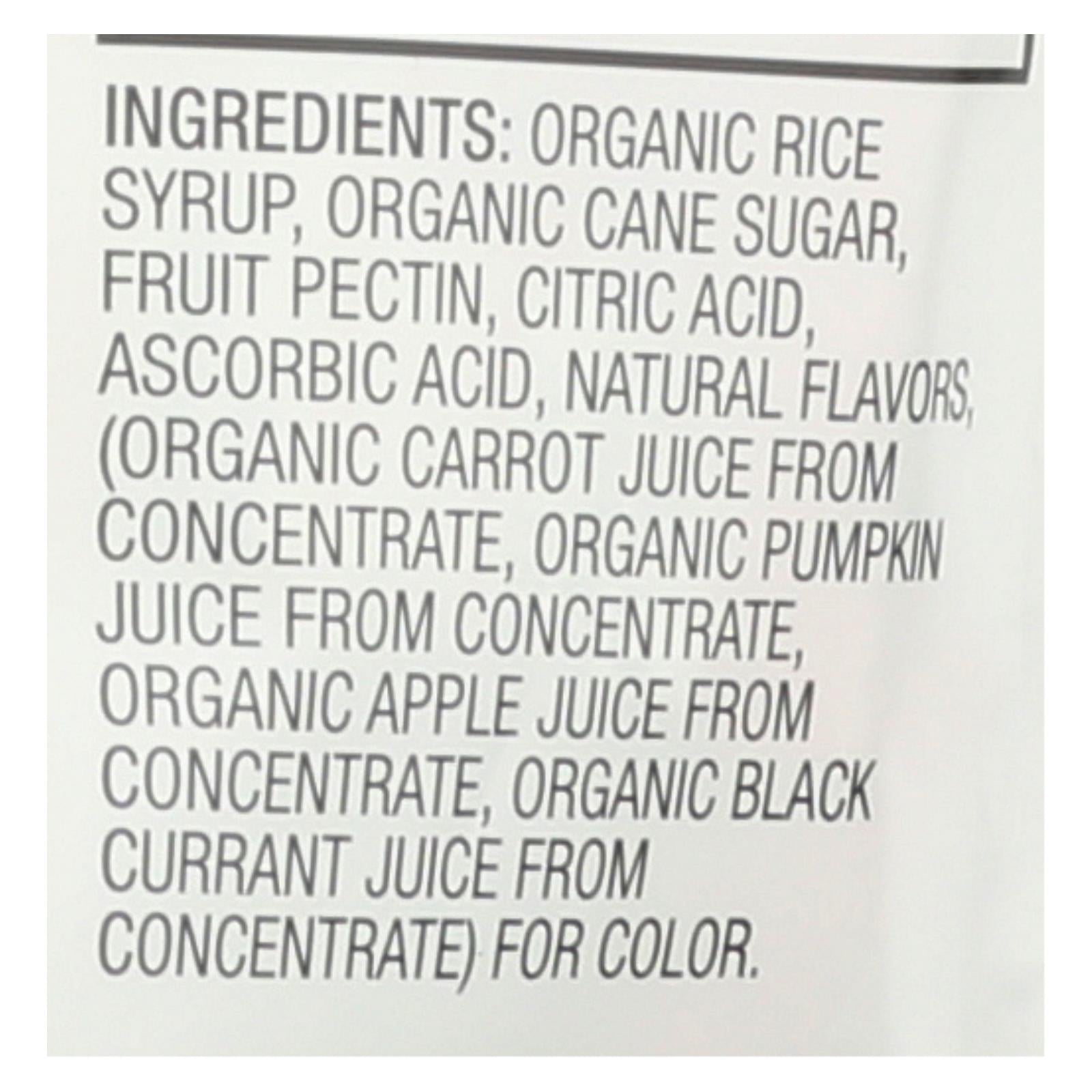 ingredients : organic rice syrup;organic cane sugar;fruit pectin;citric acid;ascorbic acid;natural flavors;(organic carrot juice from concentrate, organic pumpkin juice from concentrate, organic apple juice from concentrate, organic black currant juice from concentrate) for color
